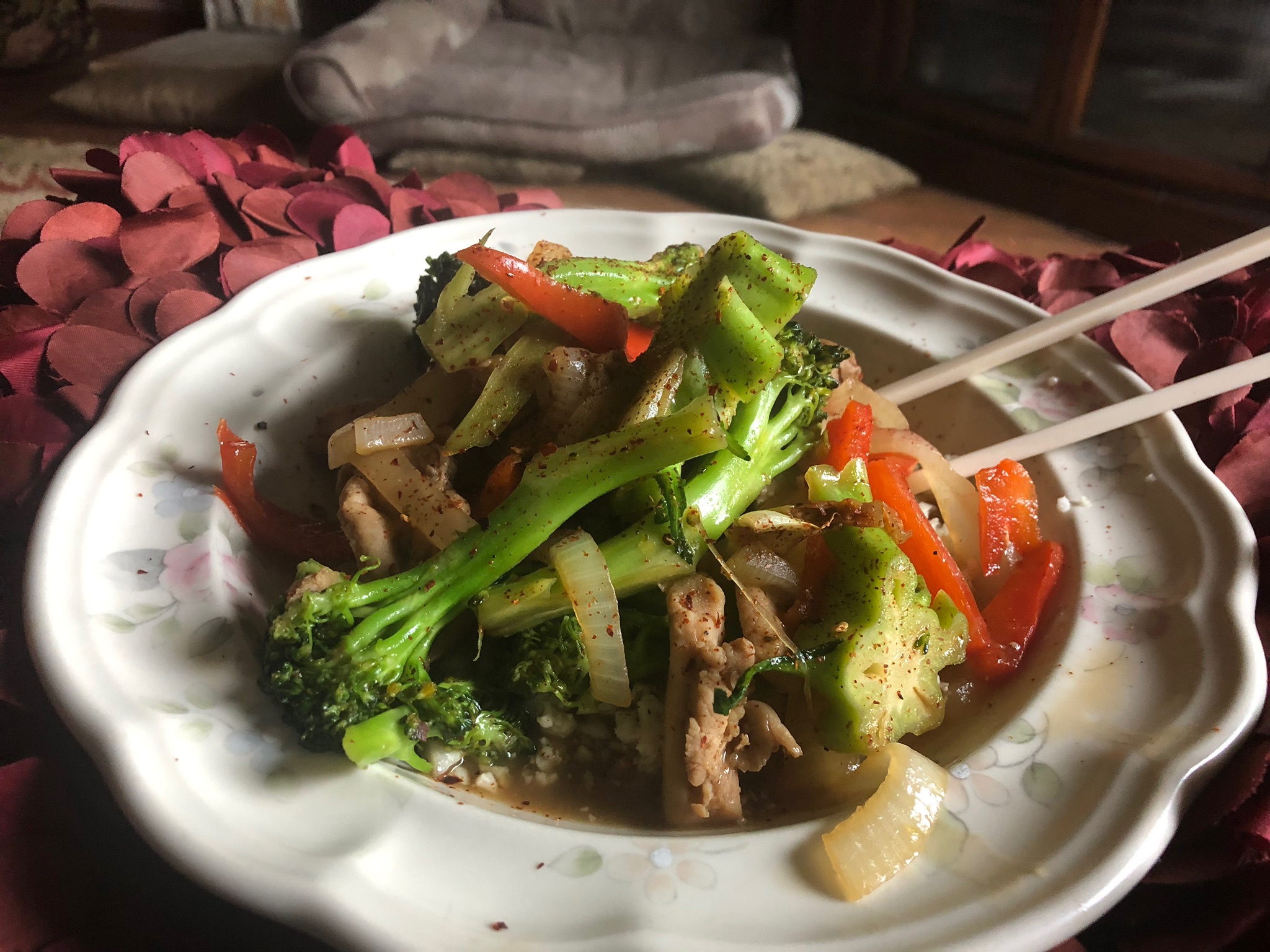 Dinner in a pinch is a quick stir-fry: chicken thighs marinated in coconut aminos, sesame oil, garlic, ginger and red pepper flakes, stir-fry with broccoli, peppers and onions and served over cauliflower rice. Simple, easy and satisfying weeknight dinner.